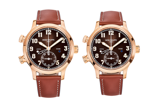 パテックフィリップカラトラバパイロットトラベルタイムウォッチの細部は、伝統的な飛行士の時計にインスピレーションを得ています。彫刻が施されたローズゴールドの数字の白い発光コーティングは、空中での視認性を実現するために茶色の文字盤で美しく際立っており、ヴィンテージのカーフスキンストラップは航空ハーネスを彷彿とさせます。